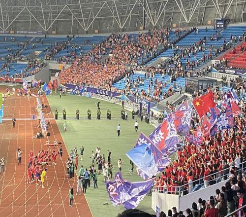 比赛结束后,仍有盐城球迷意犹未尽,久久不愿离去,站在看台上挥舞小旗帜,为球队加油。