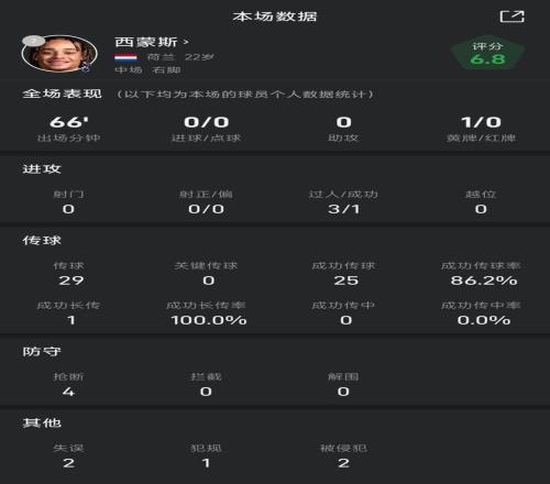 29次传球,25次成功,0次关键传球,传球成功率86.2%;