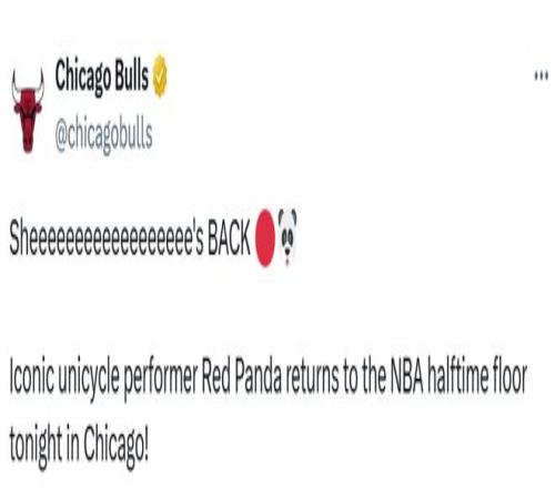 本场比赛前,公牛官方账号就宣布,此前在表演中受伤的传奇独轮车表演者“红熊猫”今天将重返NBA赛场,在芝加哥上演中场秀。视频中,“红熊猫”身着名宿乔丹的45号球衣向大家打招呼,公牛官方模仿乔丹复出时的文案,配文写道:“她回来了!”