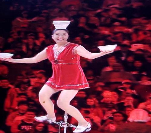 牛蓉的经典节目是:骑独轮车的同时,用小腿平衡特制彩碗,随后将碗翻转至头顶。