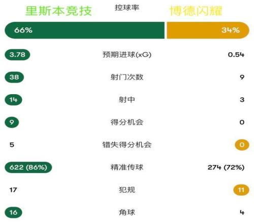 里斯本竞技全场射门38次,射正14次,预期进球3.35。自2003-04赛季Opta有记录以来,这是葡萄牙球队在欧冠单场并列最多的射门次数,上一次是布拉加在2012年9月对克卢日时的38次。