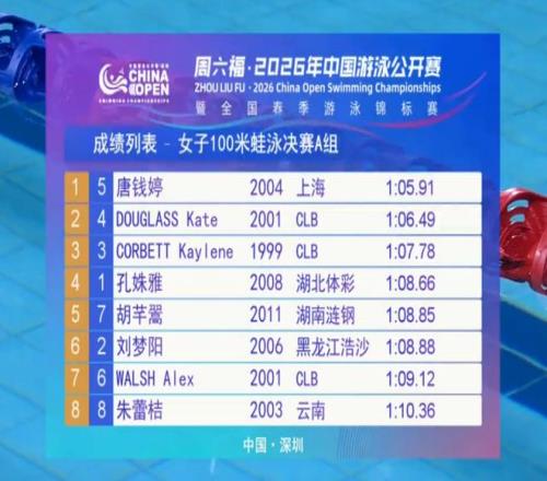 在夺冠之后,唐钱婷表示,夺得冠军在预料之中,但是成绩比较一般。显然,唐钱婷对于这个成绩并不满意。唐钱婷在去年全运会游出了1分05秒36的成绩夺得冠军。巴黎奥运会上,唐钱婷的100米蛙泳成绩是1分05秒54。此外,她在2024年游泳世锦赛以1分05秒27获得冠军。